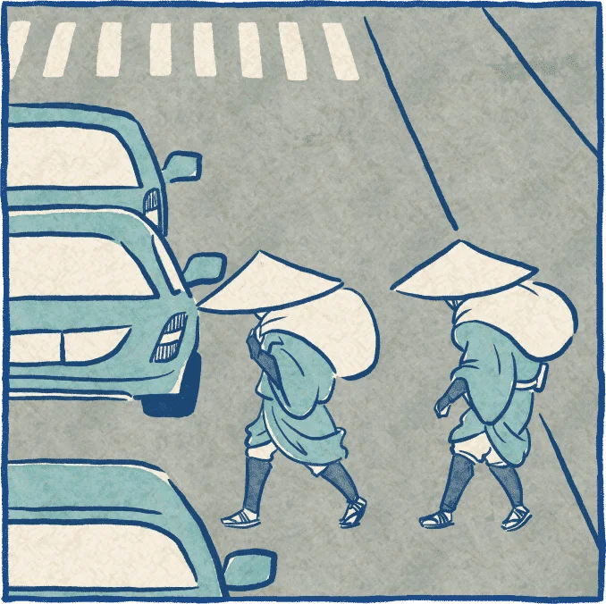 歩道を歩き、歩道のない道路では道の端を歩きましょう。