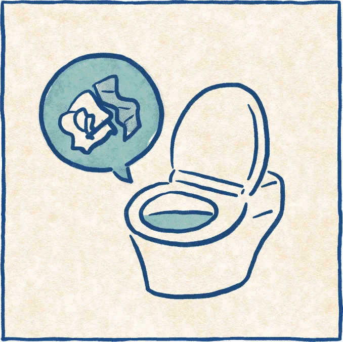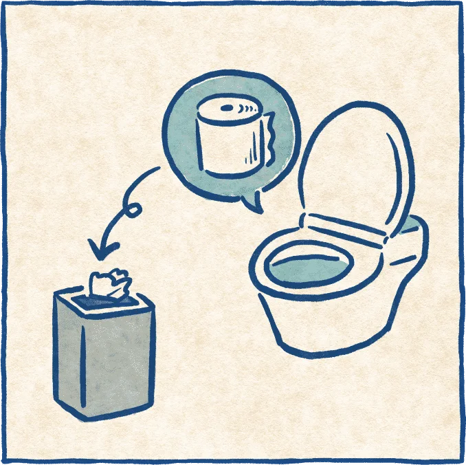 備え付けのトイレットペーパーは便器に流しましょう。ゴミ箱に捨てないでください。